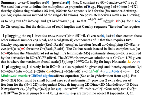 (1)Plug z=1+δz into z=zz+C, δC=0 (eq.1) and get δ(δz+δzδz)=0 which splits into Im Clifford Algebra and Real Minkowski metric components which imply that circle ds2=dr2+dt2 so δz=dseiA. Write in angle ‘A’ radian measure dependence on r,t, take the r partial derivative and rearrange and you get a Hermitian operator and so “observables” formalism and then the Dirac equation of quantum mechanics (given that Clifford algebra). See sect.1 of above postulate 1 file.