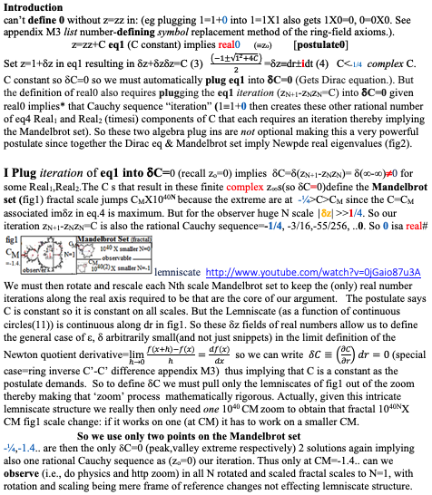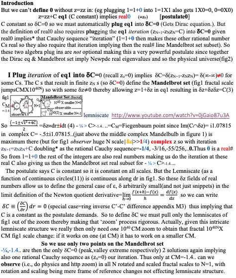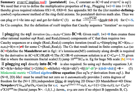 Mandelbrot Set Plug in the left side (of eq.1) z into the right side zz repeatedly and use δC=0 and get the Mandelbrot set iteration formula.The Mandelbrot set CM is (and from the postulated δCM=0), zN+1=zNzN+CM (since δ(z’-zz)=δ(zN+1-zNzN)= δ(∞-∞)=0). (the z=zz) z=0=zo. Fiegenbaum point CM smallest real line Mandelbulb on next smaller (baseline) scale. Mandelbulb areas (drdt) for smallest Clifford algebra extremum drdt.