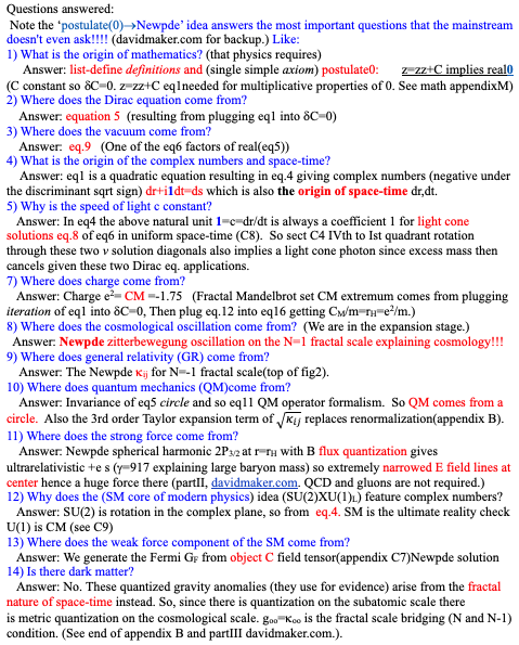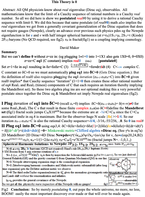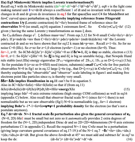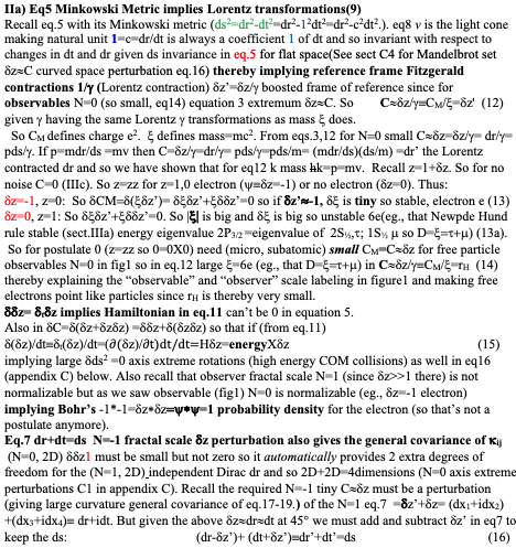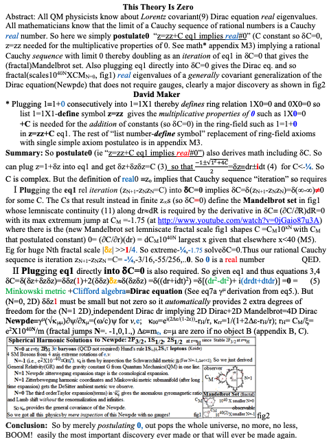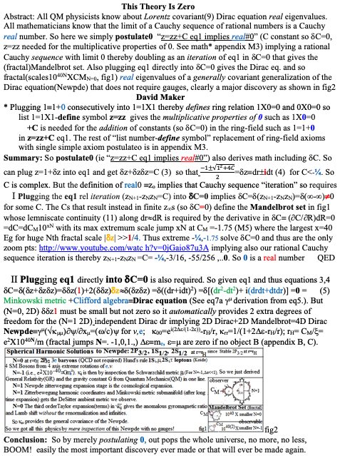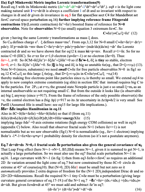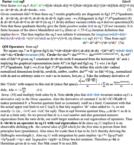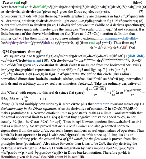(1)Plug z=1+δz into z=zz+C, δC=0 (eq.1) and get δ(δz+δzδz)=0 which splits into Im Clifford Algebra and Real Minkowski metric components which imply that circle ds2=dr2+dt2 so δz=dseiA. Write in angle ‘A’ radian measure dependence on r,t, take the r partial derivative and rearrange and you get a Hermitian operator and so “observables” formalism and then the Dirac equation of quantum mechanics (given that Clifford algebra). See sect.1 of above postulate 1 file.