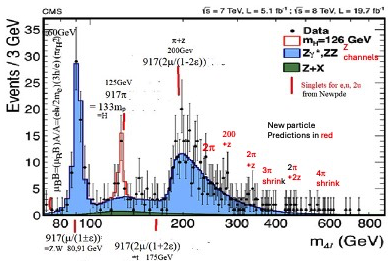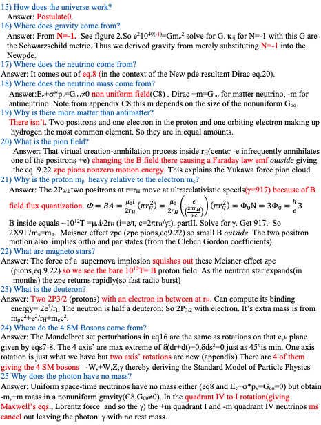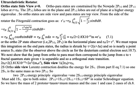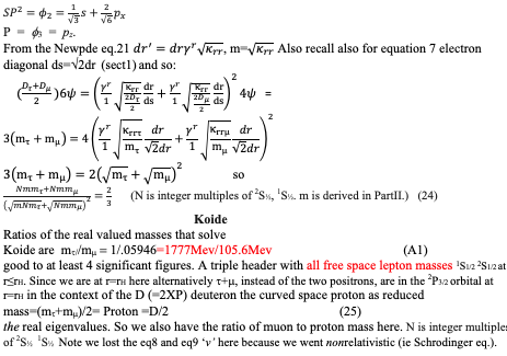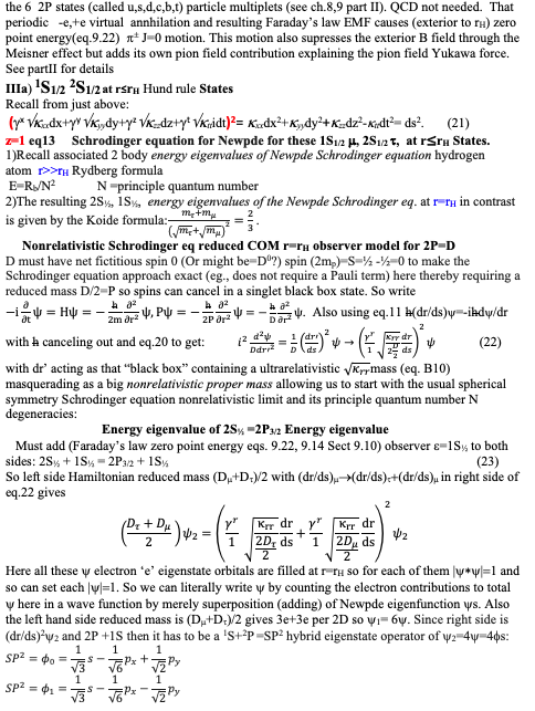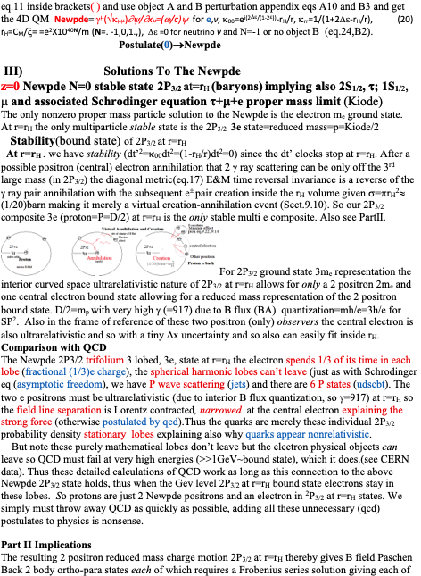 (3) The two positrons in 2P3/2 on the r=rH shell are moving rapidly, the central electron is not moving so much at the center, and this New pde 2P3/2 state is stable because of h/e flux quantization(PartII) and r=rH motion. So a Clebsch Gordon two body analysis with Paschen Back effect excitation, in a straightforward way, leads to a ortho(s,c,b) and para(t) states with ground state(u/d), the proton. Use Frobenius series solutions (Ch.9) individually for each of the s,c,b,t associated Nucleonic doublets (eg.,P,N for u/d) to get the particle multiplets. See PartII also.