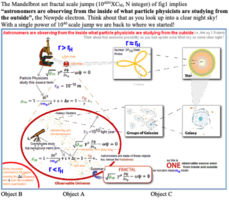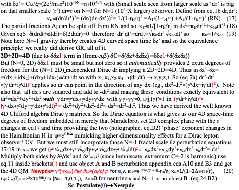 (2) Note square roots of koo=1-rH/r=1/krr in the new pde (so same kij math functionality as in the Schwarzschild metric gij but coming from QM instead.). So squaring (actually iterating) the New pde on the next higher(cosmological) fractal scale, where rH=2GM/c2, gets the Schwarzchild metric gij of GR, a one step derivation. General relativity comes out of quantum mechanics in one simple step!